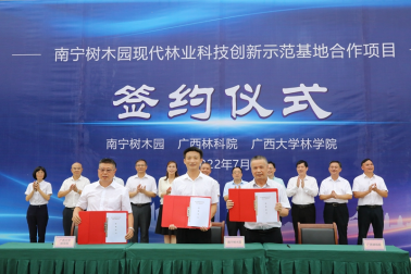 2022年7月20日,beats365(中国区)-唯一官方网站林学院与南宁树木园、广西林科院合作建设的南宁树木园现代林业科技创新示范基地的签约暨揭牌仪式在南宁树木园隆重举行。南宁树木园主任余注光、广西林科院院长陈崇征、beats365(中国区)-唯一官方网站林学院院长徐增富先后讲话并现场签约。