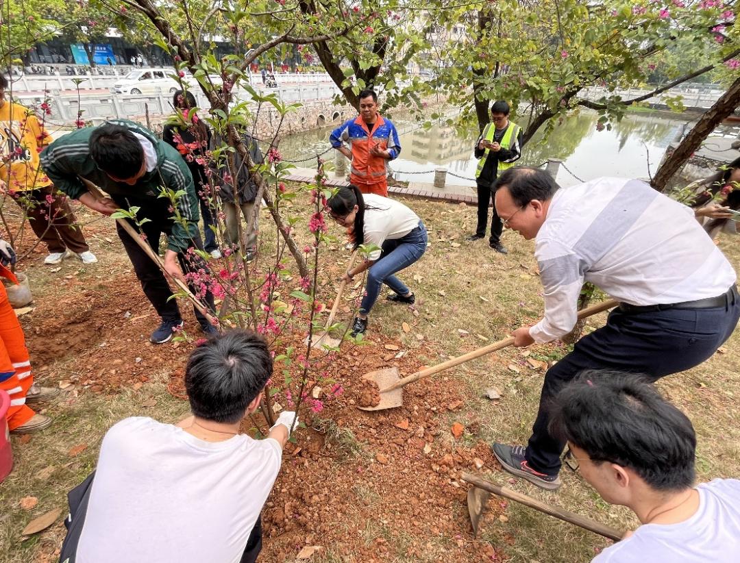 在校友林植树现场,校友代表与广西国有大桂山林场吴秦展副场长我院师生三十余名,共同种下十棵象征绿色希望的桃花幼苗,为西大的春天增添了一抹亮色。活动伊始,和太平教授鼓励同学们参与校园绿化活动,把义务植树作为一种文化传承,当作一份责任担当,强化师生爱绿、护绿、植绿的生态文明意识,珍惜发展成果,努力做生态文明建设的实践者、推动者。随后,校友广西国有大桂山林场吴秦展副场长表示,本次活动为广大同学提供了参与生态环境建设的机会,希望同学们继续牢固树立绿水青山就是金山银山理念,为广西乃至全国的林业建设作出贡献。