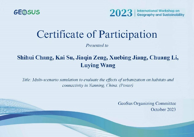 近日,我院研究生常士慧收到地理学与可持续性国际学术会议(International Workshop on Geography and Sustainability,简称GEOSUS)邮寄来的获奖证书。