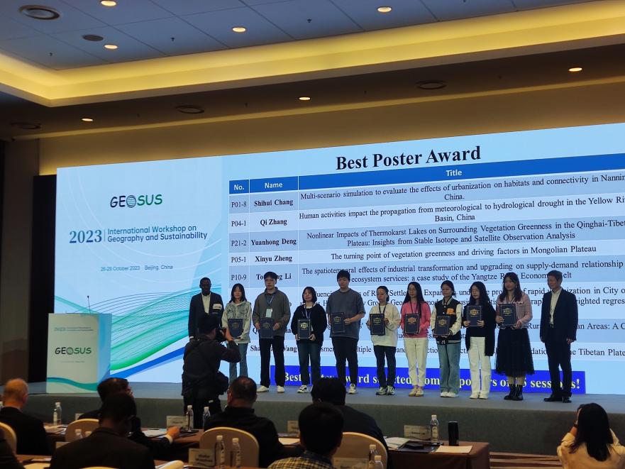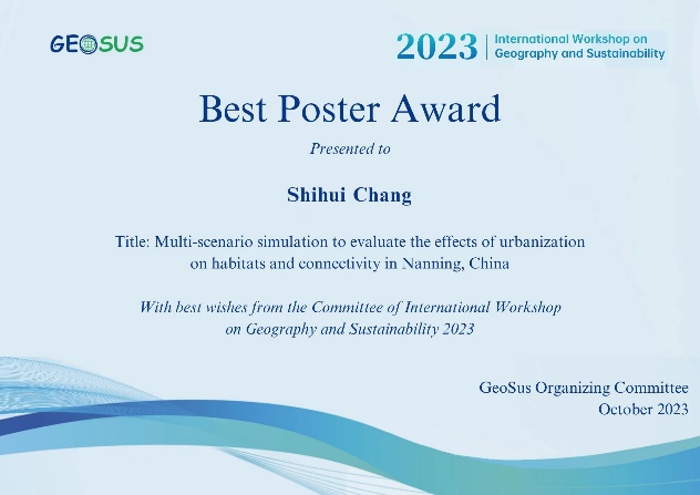 我院研究生常士慧受邀参加2023 GEOSUS,以“Multi-scenario simulation to evaluate the effects of urbanization on habitats and connectivity in Nanning, China”为题进行墙报演讲,与参会人员开展了深入交流与讨论。研有所获,我院研究生常士慧在墙报评比中获得“Best Poster Award”(最佳墙报奖)并登上颁奖台与颁奖嘉宾合影留念。