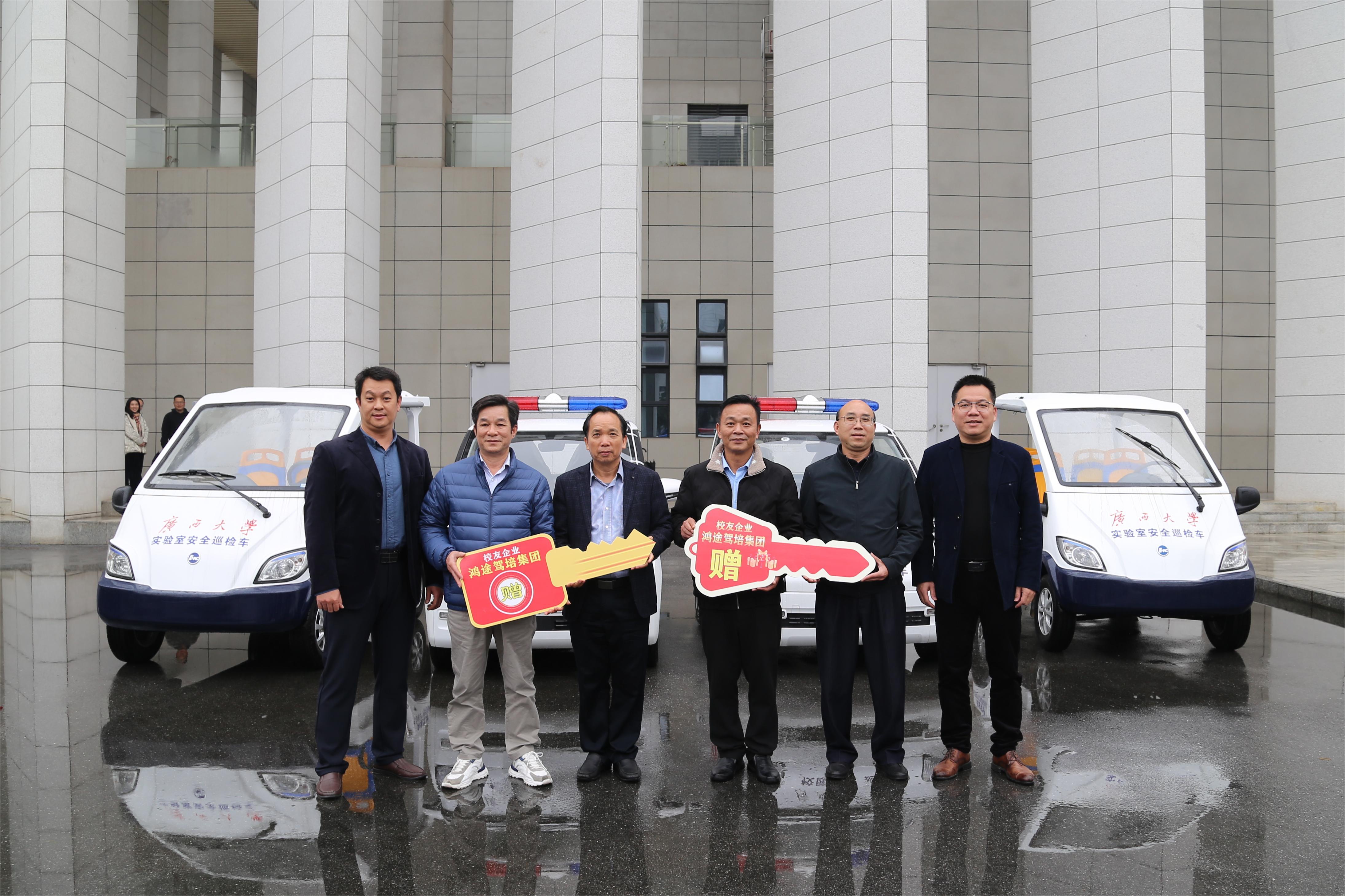 鸿途驾培集团是我院83级校友连建耀创办的驾驶员培训企业。在母校建校95周年之际,连建耀向学校捐赠四辆新能源汽车,用于校园安全巡逻,支持母校平安校园建设。连建耀校友长期热心公益事业,曾在90周年校庆前夕,向我院捐赠10万元用于设立民顺奖学金(以他的另一企业百色市民顺机动车驾驶员培训有限公司(简称“民顺驾校”)的名义冠名),奖励品学兼优学子。这充分体现了校友企业高度的社会责任感和校友对母校深厚的学子情怀。