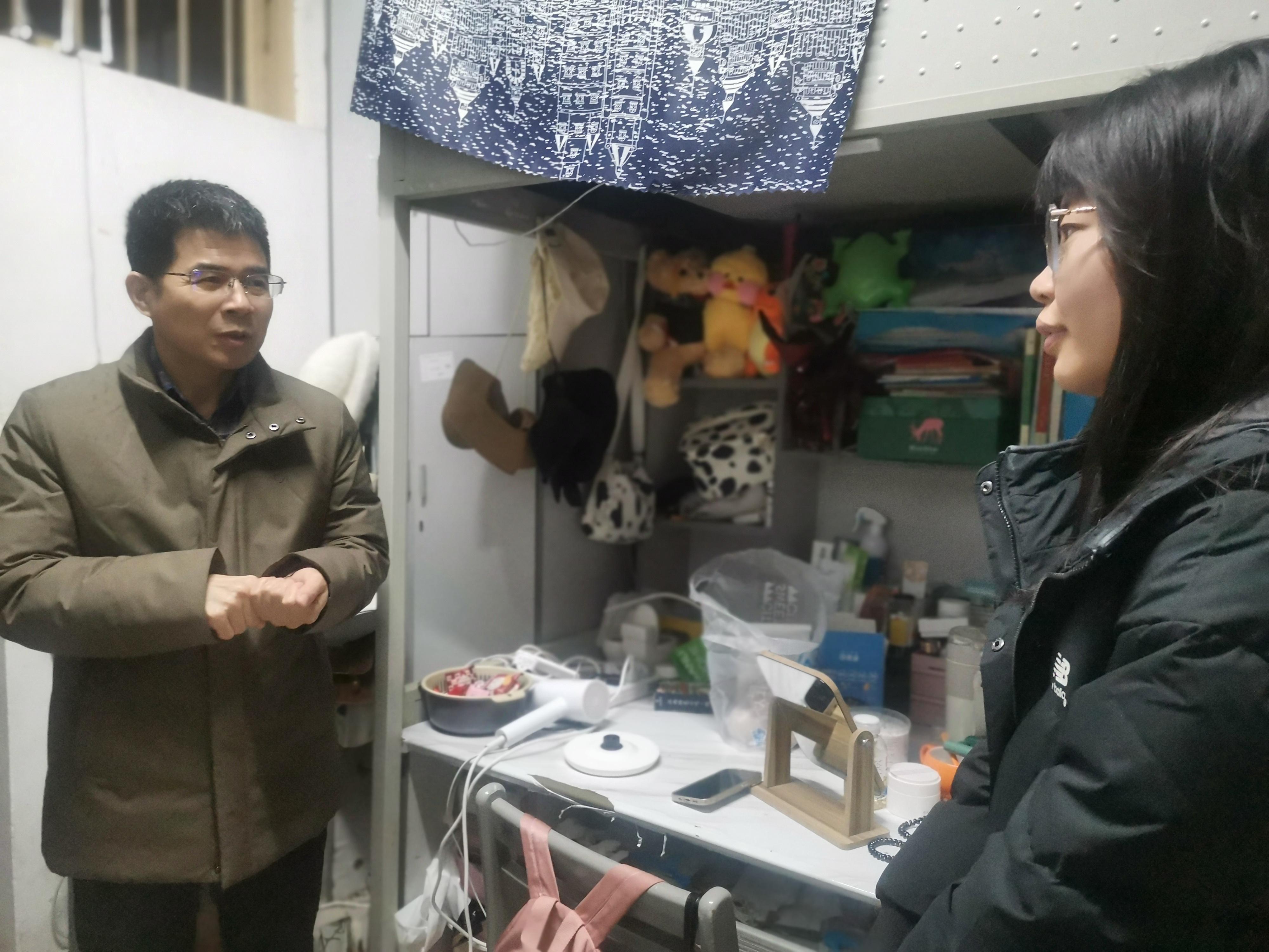 寒风伴着细雨,符韵林来到东13栋我院学生宿舍,与留校的同学亲切交谈,详细询问同学们留校期间的学习和生活情况。据同学们介绍,大多数留校的同学是因为实验不能中断,要不断监测才能获得科学精准的数据,有些实验一天都不能停,所以会有一些同学春节那几天都没法回家过。符韵林听后对同学们对学习的执着、对科学的严谨和学无止境的精神表示高度赞扬。他叮嘱同学们要做好时间规划,合理安排时间,劳逸结合,在确保学习和实验有条不紊地进行的同时,适当安排时间休息,在可能的情况下,尽量与家人团聚,把一年来的收获和喜悦与家人分享。如果确实需要留在学校过春节,学院会尽最大努力为大家提供条件,让大家过一个温暖祥和的春节。