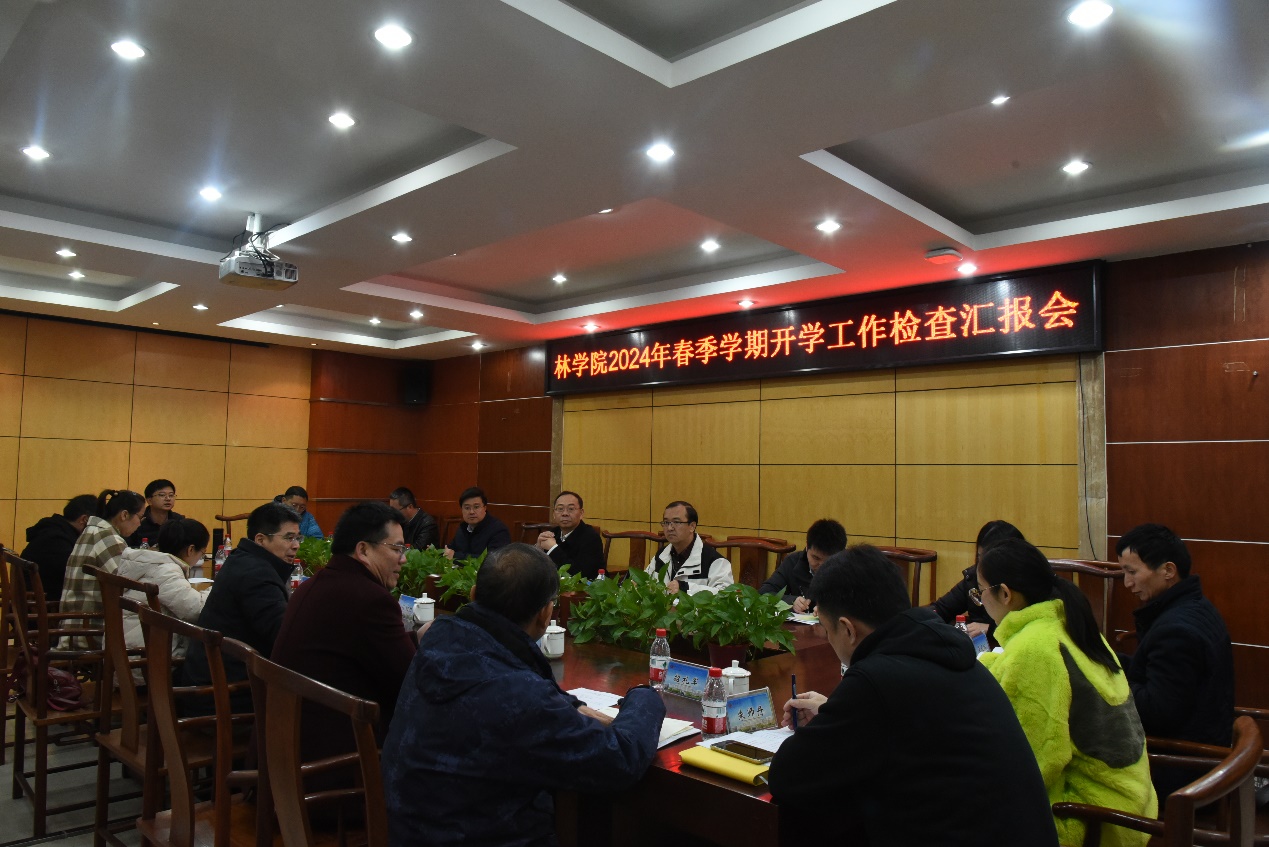 校党委常委、副校长于文进在听取汇报后充分肯定了我院为本学期开学有序开展所做的工作,并提出几点要求:一是要继续加强人才队伍建设,一方面要广纳人才,另一方面要重视高层次人才培养,积极申报自治区级和国家级人才项目;二是要在科研方面下功夫,全力参与广西林业实验室的共建工作,并充分利用这个平台提升学院科研能力;三是在林业专业博士点的申报上要积极主动开展相关工作。