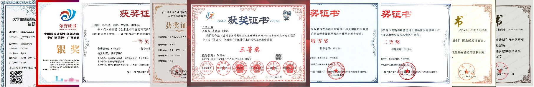科创竞赛不断突破指导大学生创新创业训练计划项目累计10项,含国家级3项、自治区级7其中3项获评“优秀”结题学生在竞赛中取得突出成绩:由2018级生态学专业吴作丽、韦江杏完成的作品荣获第十七届“挑战杯”全国大学生课外学术科技作品竞赛三等奖,实现学院在该赛事的历史性突破;2022级生态学专业韦真茜等同学获全国大学生农业资源与环境专业技能竞赛二等奖广西区级竞赛中,围绕生态修复关键技术共获奖8项,包括“挑战杯”广西区赛特等奖、一等奖、二等奖各1项,以及“互联网+”广西区赛奖项共计5项。