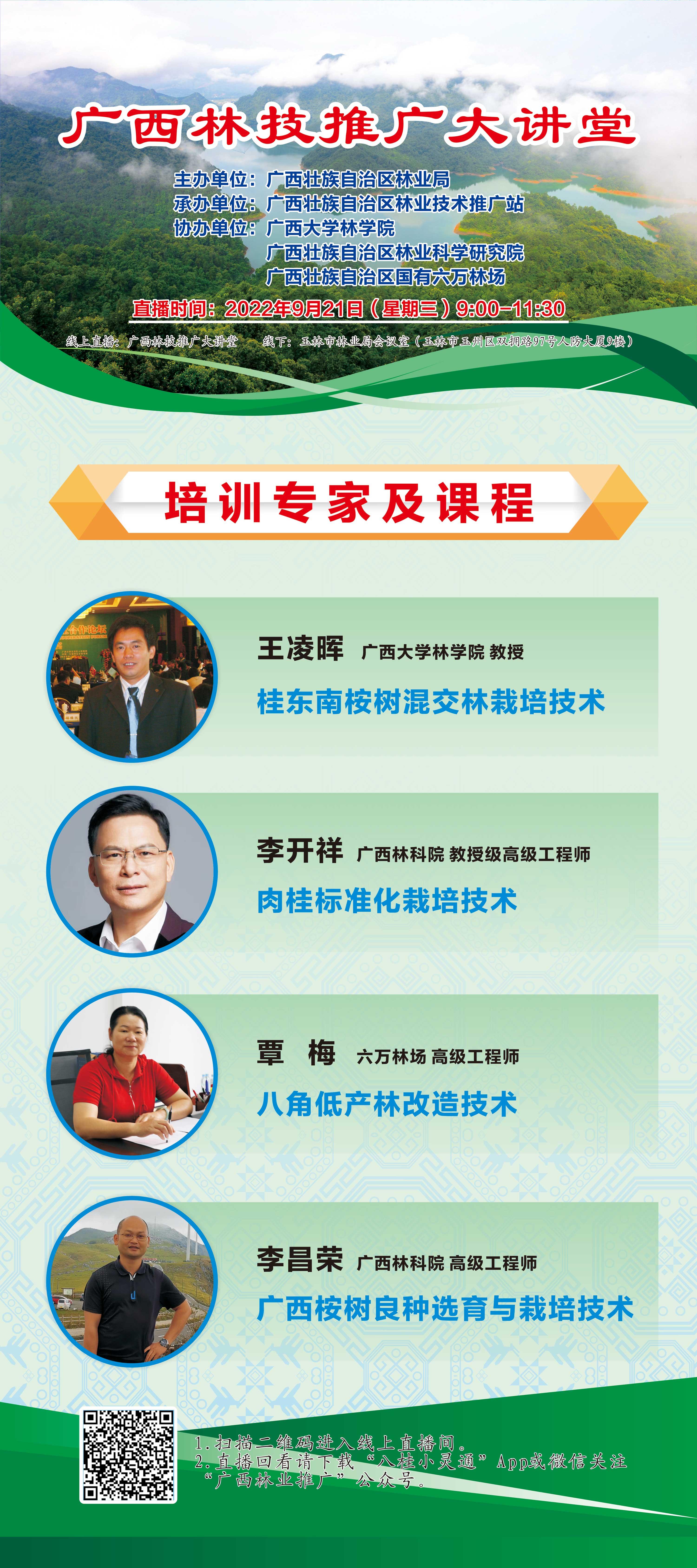 由广西壮族自治区林业局主办,我院作为协办单位之一的广西林技推广大讲堂第2期于9月21日(星期三)上午9时通过线上和线下两种方式开讲,线上直播可通过微信扫码方式进入,欢迎我院师生进入课堂听课。