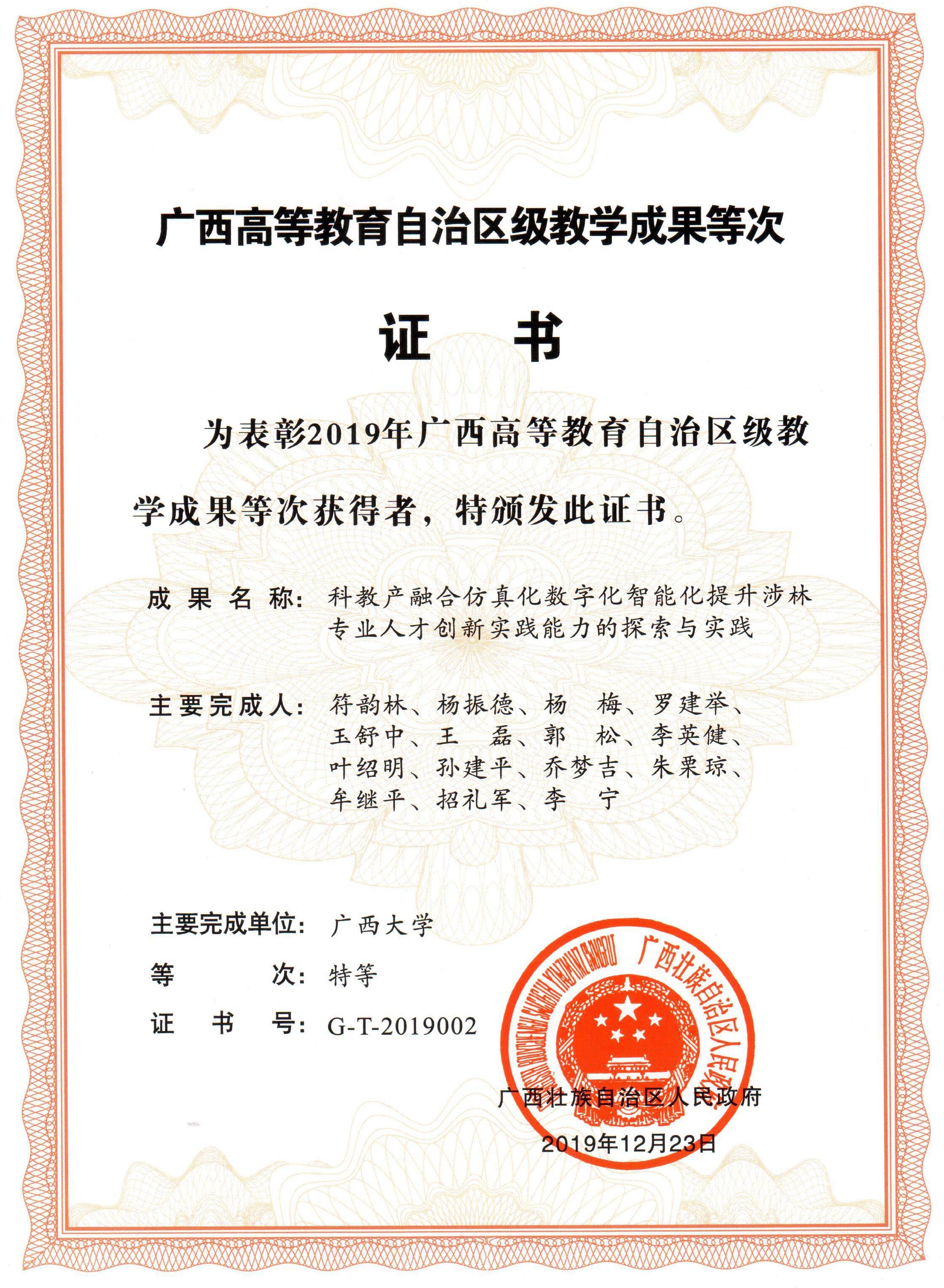 广西高等教育自治区级教学成果等次证书
