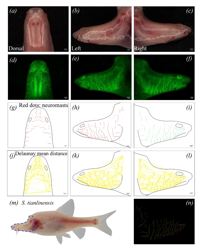 中国西南喀斯特地貌的特有洞穴鱼类金线鲃,是世界上种类最为丰富的淡水洞穴鱼类群。该研究收集了26种金线鲃,并分析了它们的感觉器官—神经丘的特征。该器官可以感知水的流动和压力变化,能影响洞穴鱼的行为并帮助其适应环境。