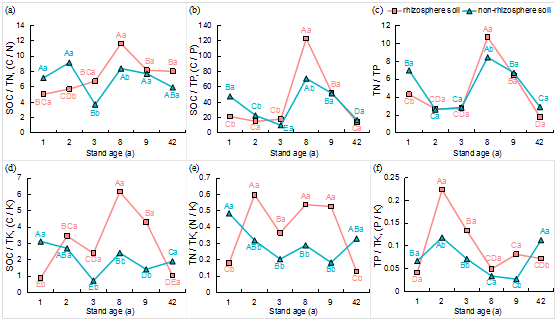 图2不同林龄下根际和非根际土壤养分化学计量比