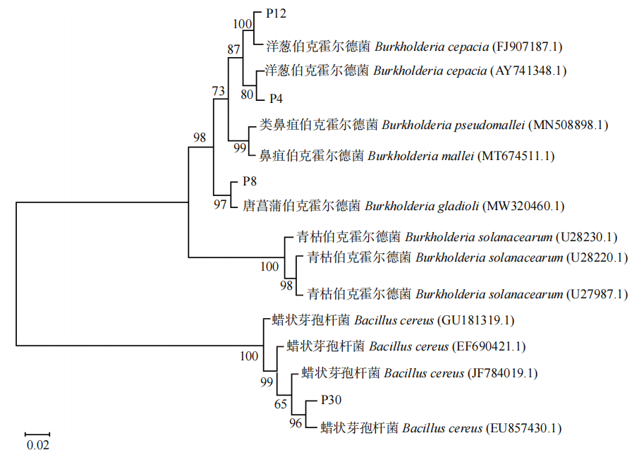 研究结果表明:从3个不同林龄(1、2和41年)望天树人工林根际共分离筛选出18株溶磷菌,其中溶磷能力较强菌株为P4、P8、P12和P30;结合各菌株的菌落特征、生理生化特征、16S rDNA序列的比对结果和系统发育树的分析,将P4菌株和P12菌株鉴定为洋葱伯克霍尔德菌(Burkholderia cepacia),P8菌株为唐菖蒲伯克霍尔德菌(Burkholderia gladioli),P30菌株为蜡状芽孢杆菌(Bacillus cereus)。4株溶磷菌株在30~35℃,pH为5.5~8.5,NaCl质量分数为0~2.5%时均具有良好的溶磷能力,对磷酸铝和磷酸铁的溶磷量均达300 mg/L,菌株对温度和pH的耐受性较广,在南方酸性土壤具有较大的应用潜力,有望作为望天树专用溶磷菌肥研制的优质菌株。筛选得到的4株高效溶磷菌具有良好的溶磷能力,且能够溶解多种难溶性无机磷酸盐,可用于望天树专用微生物肥料的研发,具有良好的应用潜力。(该研究结果以“望天树人工林根际溶磷细菌的筛选及溶磷特性”为题发表在《北京林业大学学报》,2020级硕士研究生韦双为该论文的第一作者,杨梅教授为通讯作者。该研究获得国家自然科学基金项目(31960307),以及广西自然科学基金项目(2018GXNSFAA28110)共同资助)。