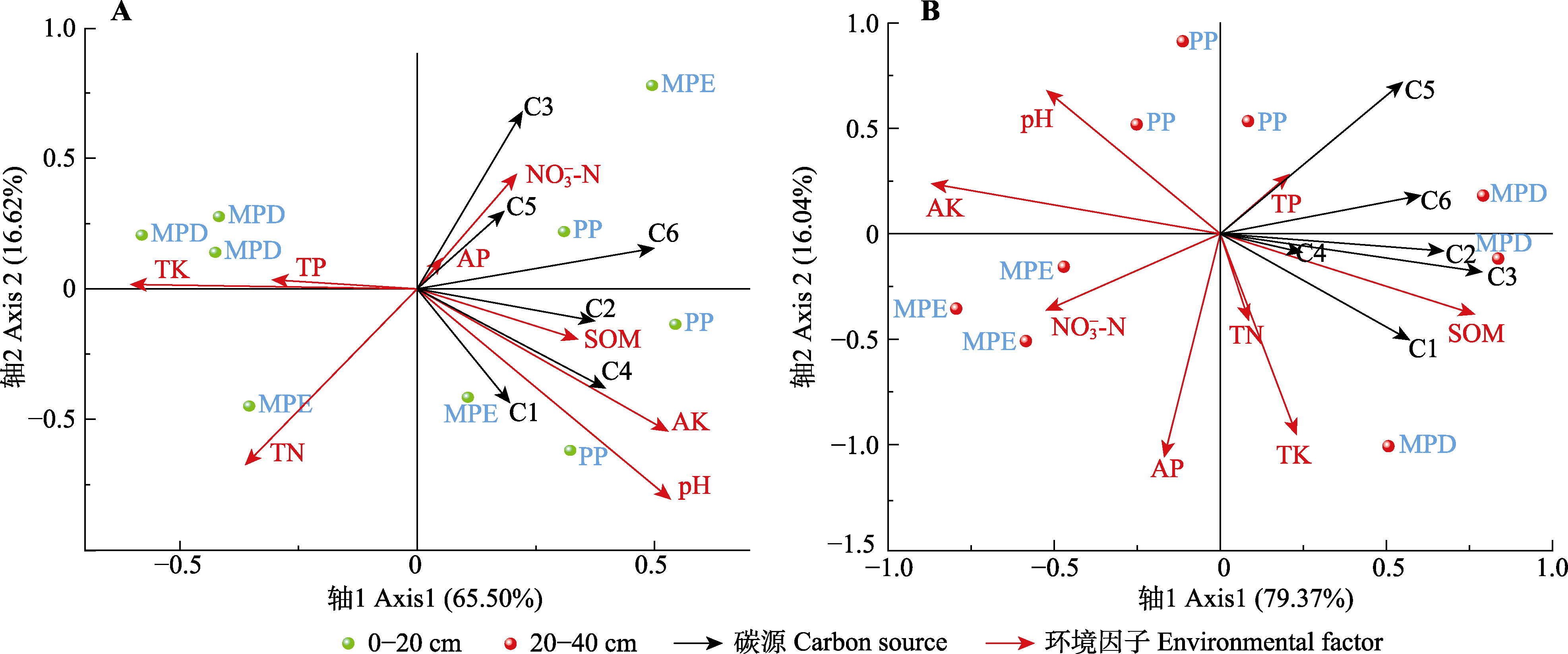 图4 土壤微生物群落碳源利用与环境因子的冗余分析(RDA)