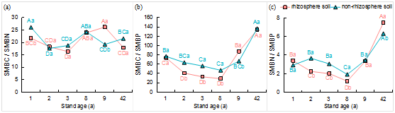 图3不同林龄下根际和非根际土壤微生物量的化学计量