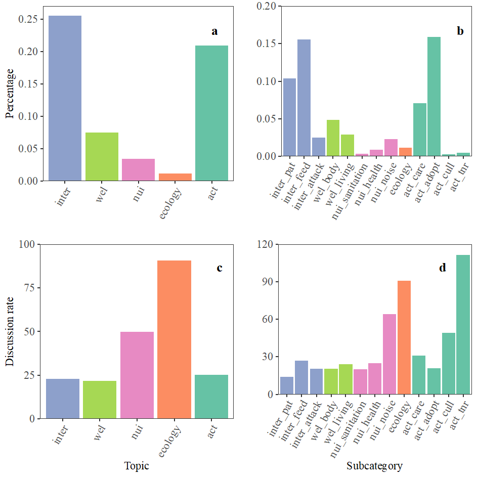 图1.流浪猫相关话题不同主题的帖子数量与讨论度。主题1人与流浪猫的互动(接近流浪猫,投喂流浪猫,流浪猫攻击人类),主题2流浪猫自身动物福利(流浪猫身体状况,流浪猫居住状况),主题3公共滋扰(公共卫生,人畜健康,流浪猫扰民),主题4生态影响,主题5未来应采取的行动(呼吁关爱流浪猫,呼吁领养,致死控制手段,捕捉-绝育-放归控制手段)。