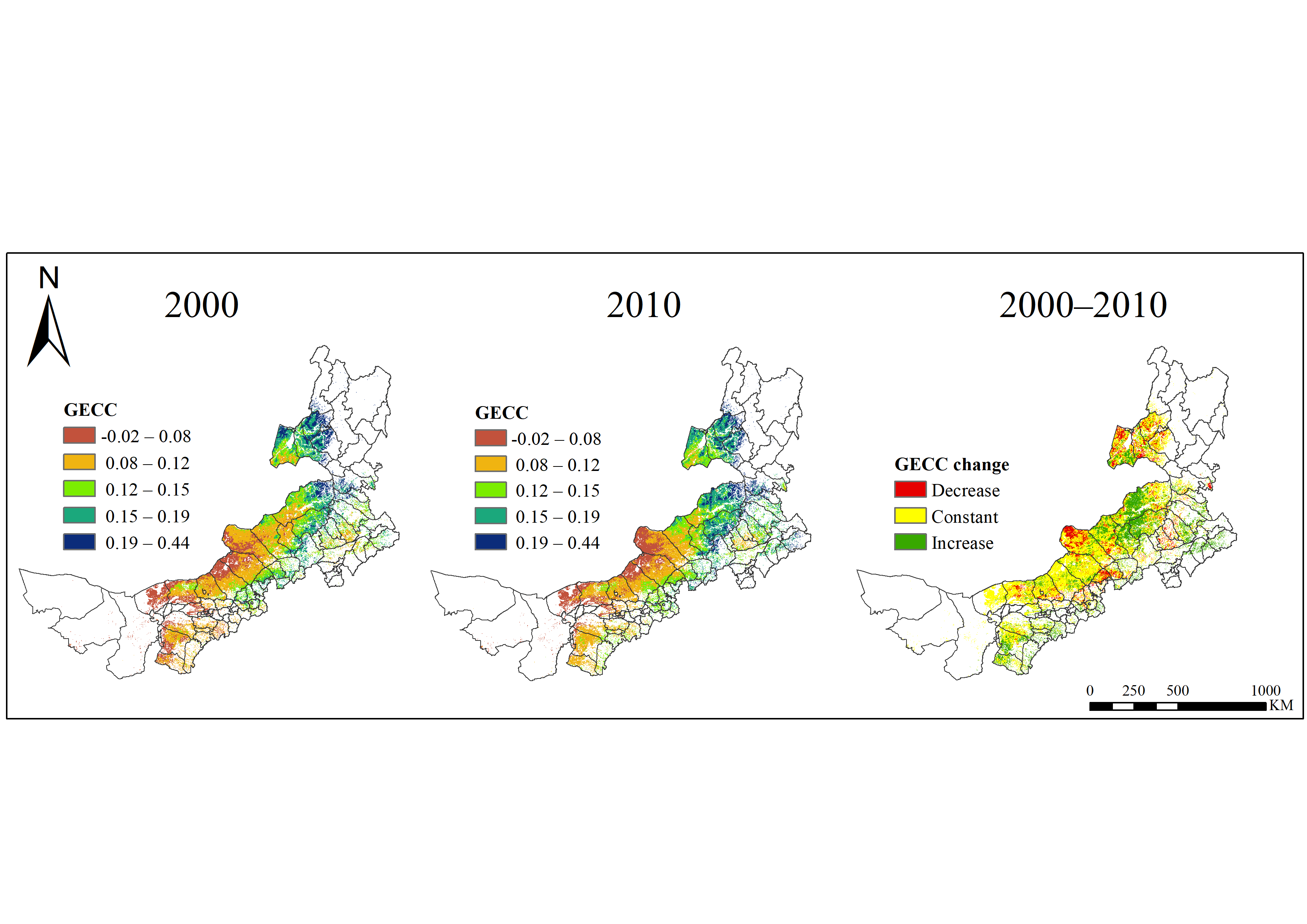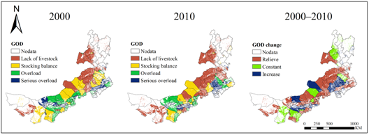 2000-2010年放牧超载程度空间分布及变化情况分布