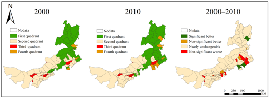 2000-2010年基于四象限模型空间分布及变化情况分布