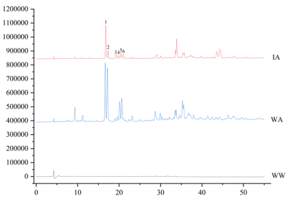 首先,参照沉香行业标准,检测醇溶性提取物含量、显色反应、高效液相特征图谱。其中诱导沉香和野生沉香的醇溶性提取物均已达到行标要求的10%(图3);醇溶性浸出物经加热之后,香草醛-浓盐酸可以对样品主要的挥发性物质倍半萜显色,样品的显色反应见图4,诱导沉香和野生沉香的显色反应主要为樱桃红、淡紫色;目前,高程度氧化的5,6,7,8-四羟基-2-(2-苯乙基)色酮类成分仅在沉香中发现,具有专属性,可作为高效液相法鉴别沉香真伪和质量控制的特征性成分。沉香样品的高效液相特征图谱见图5。根据行标,16分到22分连续出现的6个峰分别为沉香四醇、(5S,6R,7S,8R)-2-[2-(4-甲氧基-苯乙基)]-5,6,7,8-四氢色酮、异沉香四醇、(5S,6R,7R,8S)-2-[2-(4-甲氧基-苯乙基)]-5,6,7,8-四羟基-5,6,7,8-四氢色酮、沉香色酮B、沉香色酮C。诱导沉香和野生沉香均存在特征峰,说明诱导沉香和野生沉香都符合沉香的行业标准。
