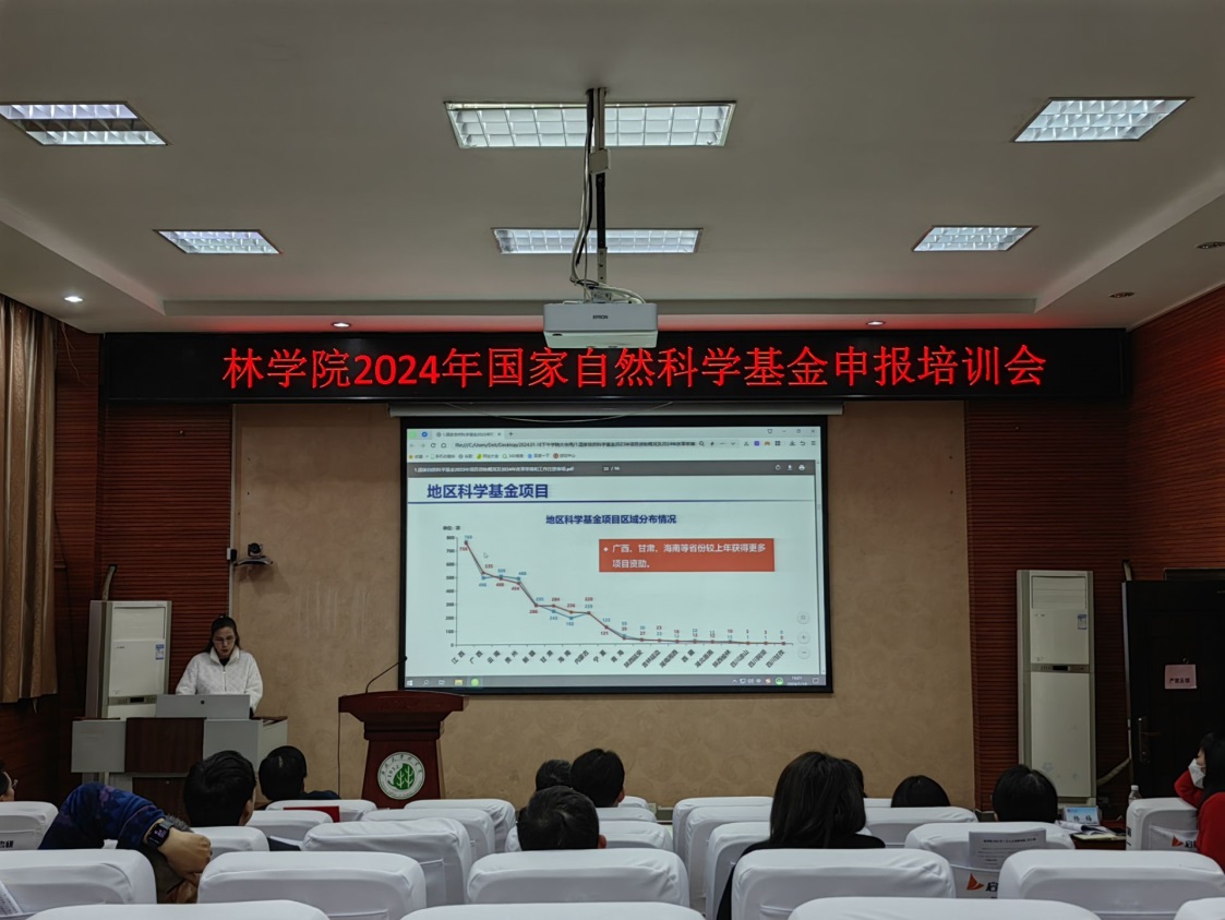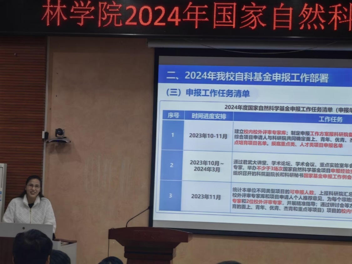 为进一步提高学院的国家自然科学基金申报质量,2024年1月18日下午,我院在112报告厅召开林学院2024年国家自然科学基金申报培训会。学院领导班子全部出席,全体教职工参加大会,会议由副院长杨梅主持。