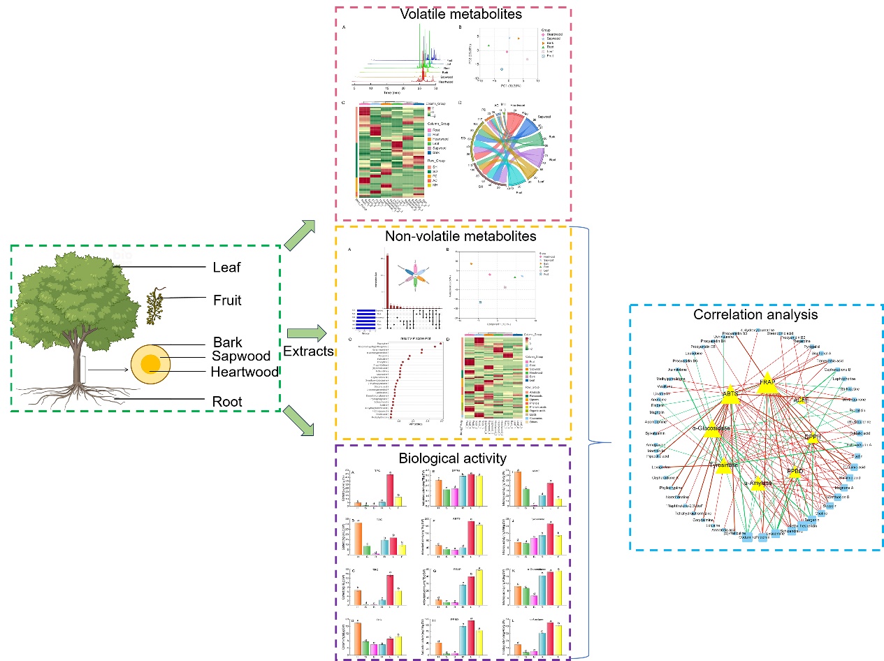 图一 醉香含笑6个部位生物活性成分代谢组学分析及其生物活性相关性