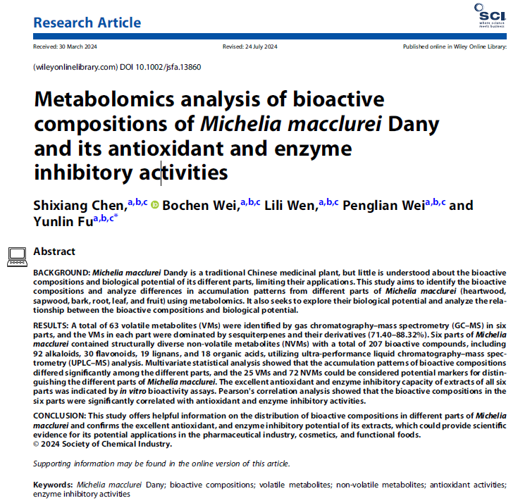 近日,林学院符韵林教授团队在醉香含笑生物活性成分和生物学潜力方面取得重要成果。研究成果《Metabolomics analysis of bioactive compositions ofMichelia macclureiDany and its antioxidant and enzyme inhibitory activities》(醉香含笑生物活性成分代谢组学分析及其抗氧化和酶抑制活性)发表于农林科学领域期刊Journal of the Science of Food and Agriculture(中国科学院2区,IF=3.3)。我院生态学博士研究生陈仕香为第一作者,符韵林教授为通讯作者。该研究得到了国家自然科学基金(32171702)的支持。