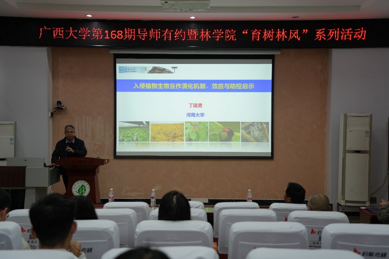 12月19日上午,beats365(中国区)-唯一官方网站第168期导师有约暨林学院“育树林风”学术文化系列活动在学院112举行。本次活动邀请河南大学特聘教授、生态学学科带头人丁建清教授为师生作“入侵植物生物互作演化机制、效应与防控启示”学术讲座,吸引了学院80余名师生参加,学院副院长招礼军教授主持会议。