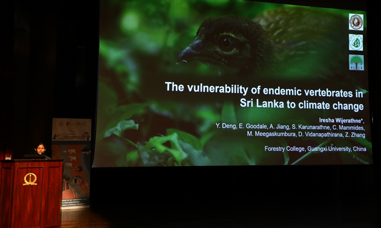 Iresha Wijerathne(艾丽莎)在SCCS大会上进行报告题为"Vulnerability of Endemic Vertebrates in Sri Lanka to Climate Change”。这项研究强调了解气候变化背景下特有脊椎动物分布变化的重要性,特别是在斯里兰卡等生物多样性丰富的岛屿。以斯里兰卡233种特有脊椎动物为研究对象,研究其分布现状与未来的变化。研究结果表明,西南湿区和中部高地目前是并将继续是这些特有物种最适合的栖息地。然而,这些物种的总体分布区域预计将在未来缩小。在目前被确定为特定生物多样性区的地区,特别是在高海拔地区,这种影响将更为严重。该研究强调了山地特有物种面临的风险,特别是分布受限的两栖动物和爬行动物将面临不确定的未来,因为潮湿地区容易受到城市化的影响。讨论了在快速气候变化条件下开展分布研究的重要性,以及如何利用研究成果保护生物多样性。