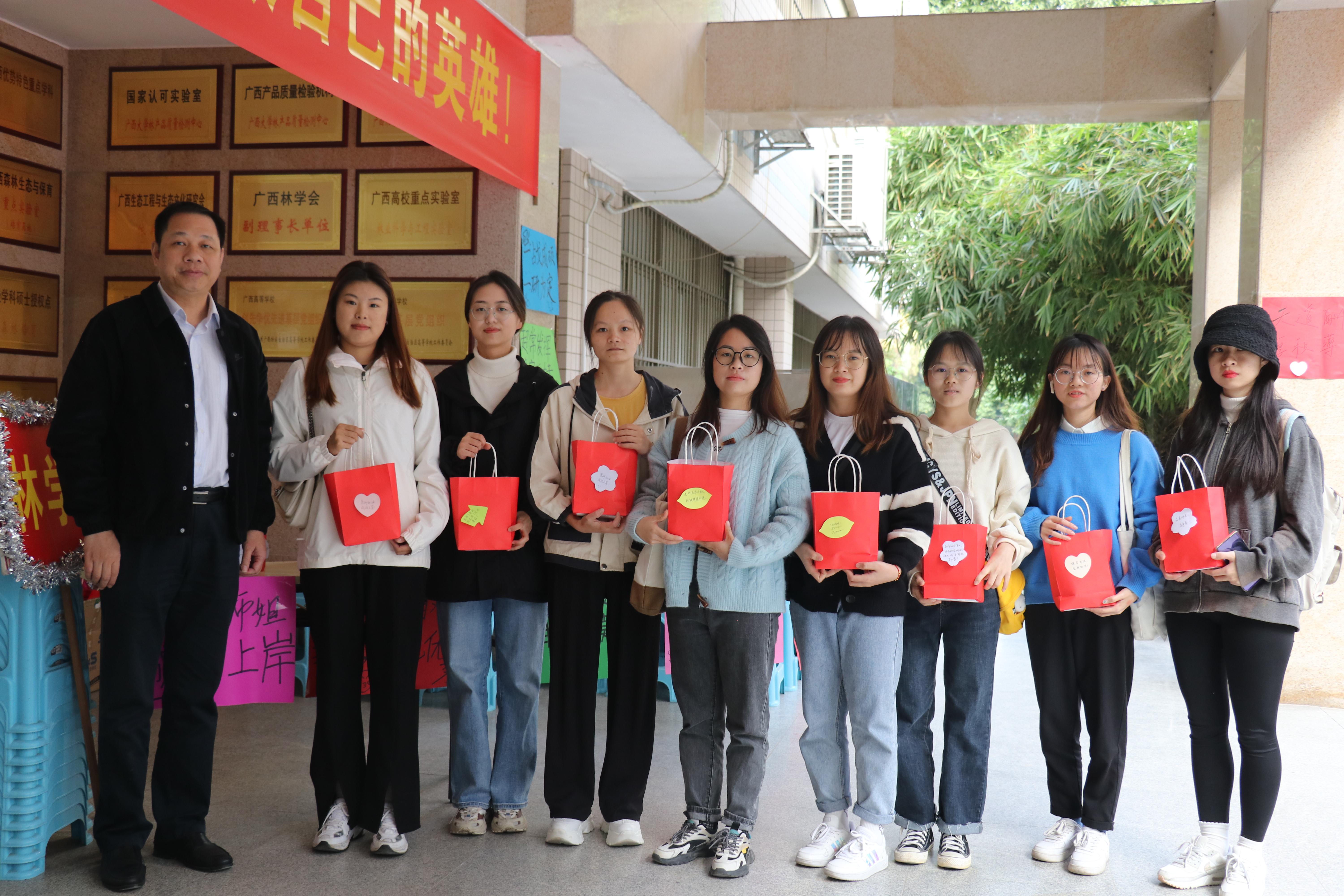 为缓解2022届考研学子的备考压力、坚定考研信心。12月17日下午,林学院党委书记覃宪儒、党委副书记徐丽以及师生代表们在学院南门、考研学生宿舍为考研学子送上学院精心准备的“暖心礼包”,为考研学子加油助力。