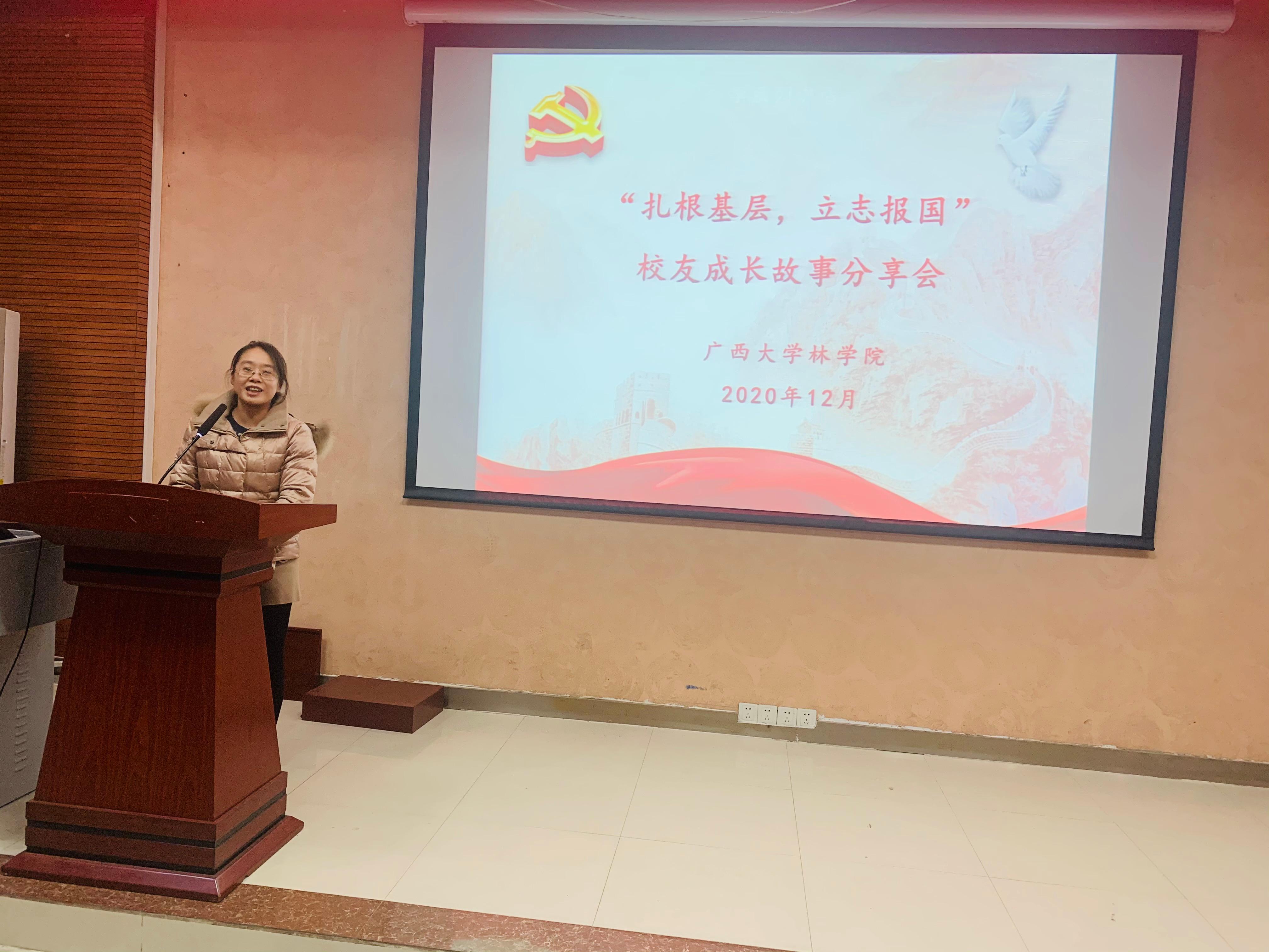 为鼓励林苑学子扎根基层,勇担强林兴林使命,12月26日林学院在学院112教室举办了“扎根基层,立志报国”主题校友成长故事分享会。我院黄超群、周江悦、谭诗蓓、申庆海和黄瑞琛五位扎根基层优秀青年校友作为嘉宾分享成长故事。院党委副书记徐丽、院团委书记银宁、院团委副书记马奕、院辅导员李琼莹、孙静以及学生代表100余人参加分享会。