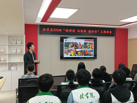 为贯彻落实党的二十大精神,深入实施“生态优先”战略,引领学林青年加强推动绿色高质量发展的信念和决心,3月5日上午,我院邀请到第十六届全国“大学生年度人物”入围奖获得者吴中华和“全国优秀共青团员”获得者马朝阳,在东30栋学生宿舍园区多功能活动室为林学类223班新生代表做主题分享。院党委副书记徐丽,团委书记银宁、团委副书记李琼莹出席本次活动。