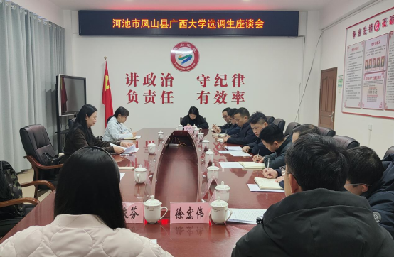为深入贯彻落实学校党委关于选调生工作的决策部署,持续推进“君武青苗”行动计划,12月4日,我院党委书记黄里云带队赴河池市宜州区和凤山县开展选调生专项调研与校地交流活动。宜州区委组织部部长韦克、副部长韦兴杰,凤山县委组织部部长兰昊、副部长李万胜分别出席当地座谈会,我校在两地工作的15名选调生代表(其中宜州7名、凤山8名)参会交流。我院副院长袁荣卿、辅导员张生一同参与调研。