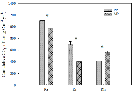 图1桉树纯林(PP)和桉树/马占相思混交林(MP)的土壤总呼吸年累积量(Rs)、自养呼吸年累积量(Rr)和异养呼吸年累积量(Rh)