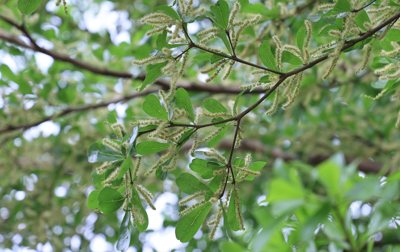 小叶榄仁的花为穗状花序,腋生,长10-15厘米,花小而密集,呈黄绿色。花萼5裂,花瓣缺,雄蕊10枚,两轮排列。