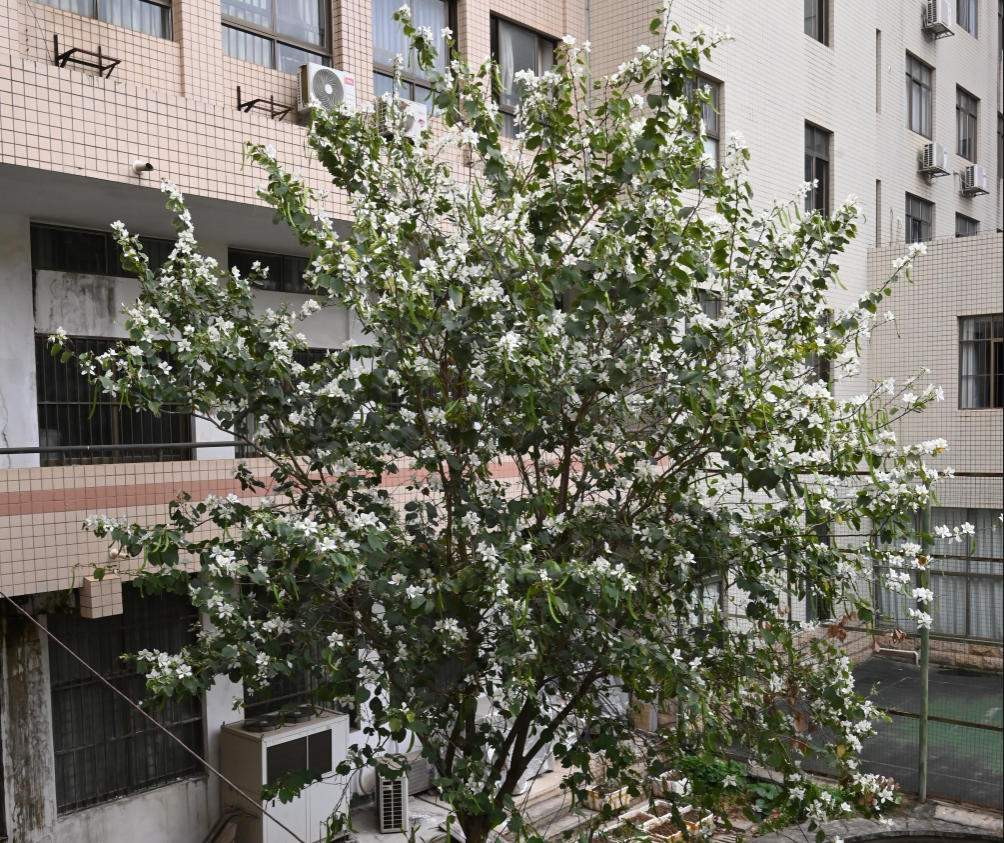 beats365(中国区)-唯一官方网站第四教学楼院子里盛开的白花宫粉羊蹄甲